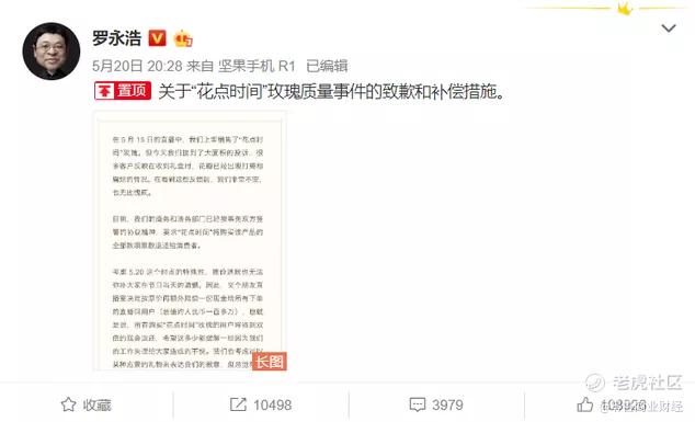 之前,罗永浩与花点时间合作售卖520玫瑰礼盒,不少用户收到鲜花后反映有质量问题,罗永浩团队的解决方式是按原价再额外补偿,赔偿金额达到人民币一百多万。