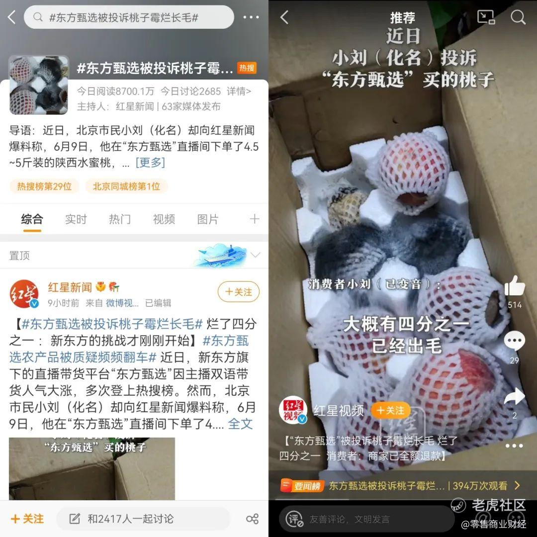 一位生鲜类目的商家向「电商在线」表示,这次东方甄选的桃子霉烂长毛很难说清是不是“翻车”,消费者是到货两天后才取货,正值夏日,桃子这种水果闷了两天就更容易出现问题,“很难说清是什么时候开始变质的”。