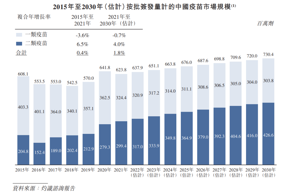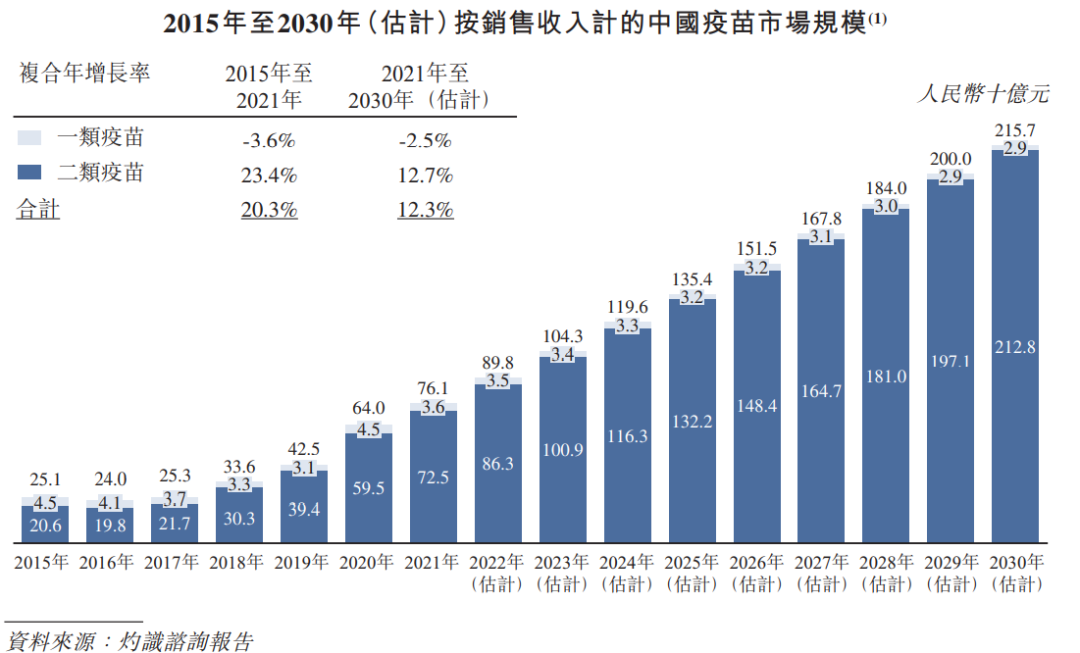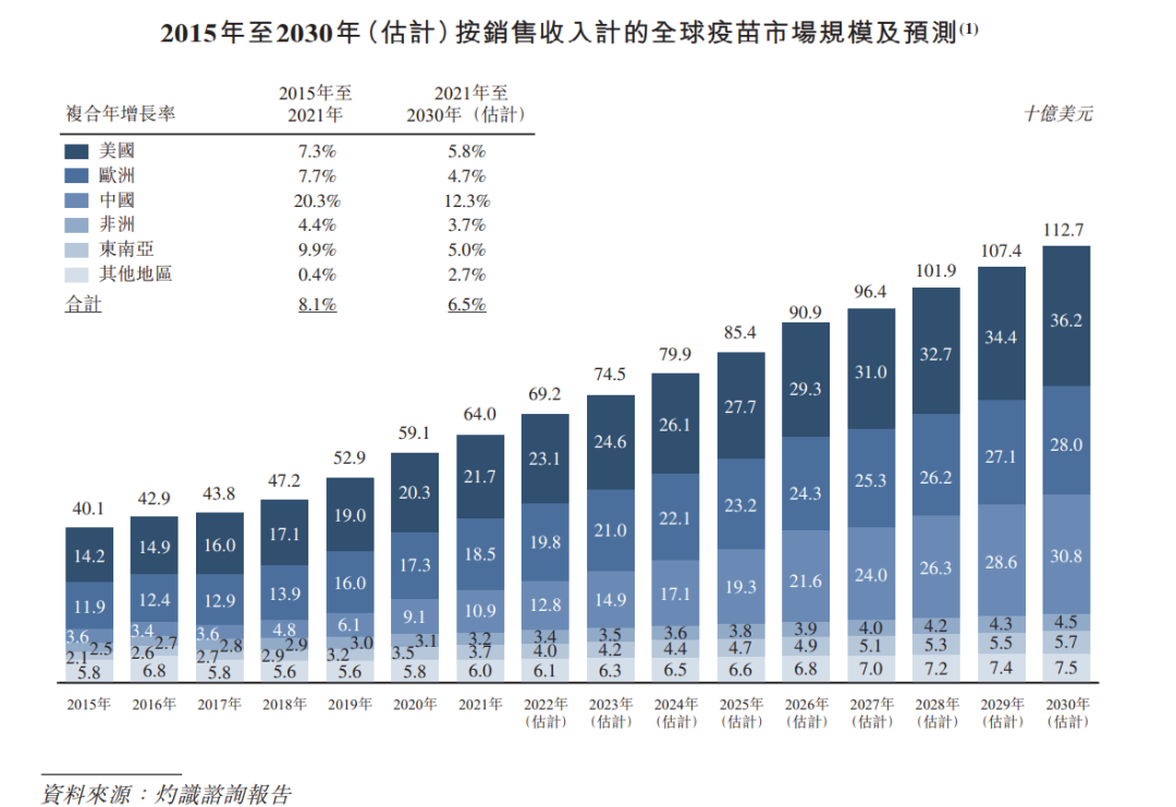 随着发达国家及发展中国家创新疫苗的普及和增长的医疗支出,特别是在爆发COVID-19疫情后疫苗接种意识的提高。据灼识咨询报告,从销售收入看,全球疫苗市场从2015年的401亿美元增长至2021年的640亿美元,并预计将于2030年达到1127亿美元(COVID-19疫苗除外)。如果将COVID-19疫苗也考虑在内,全球疫苗市场规模将进一步扩大。2021年,全球COVID-19疫苗市场规模为约900亿美元。