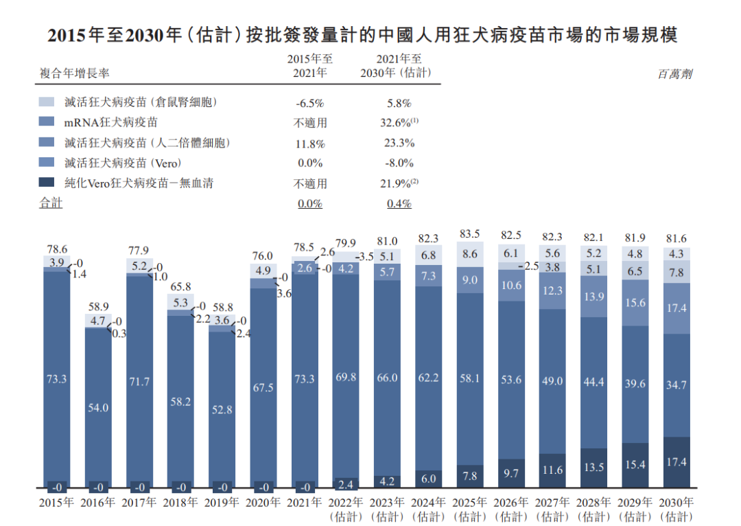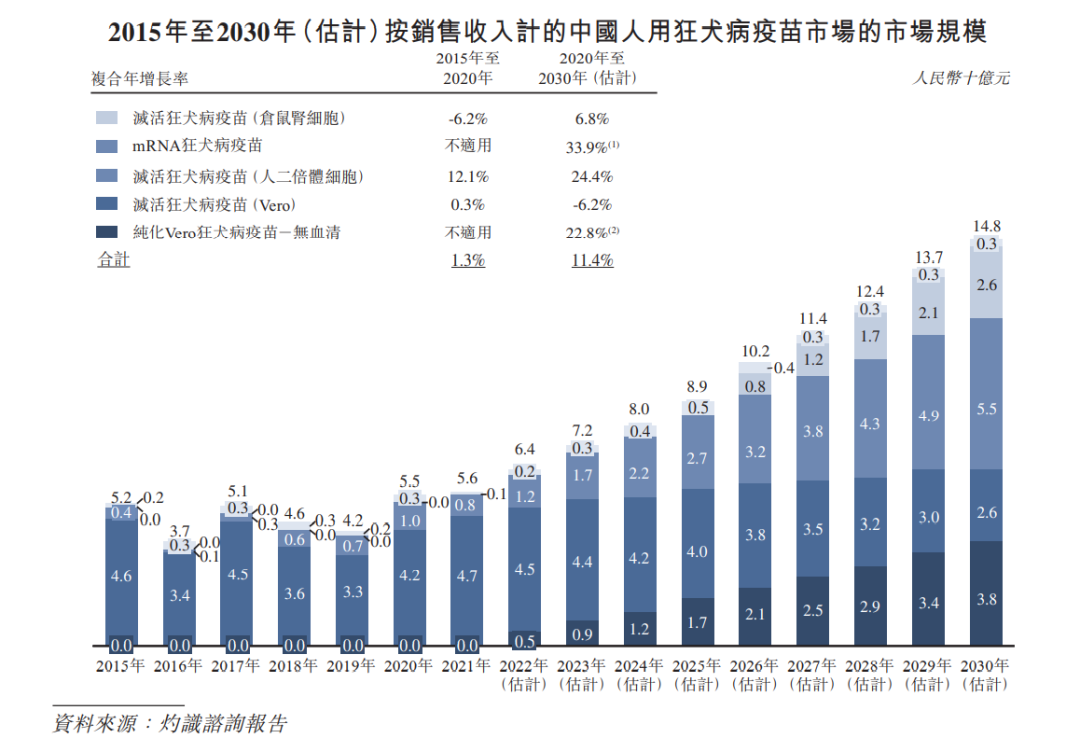 中国是全球最大的人用狂犬病疫苗市场。在中国销售的所有人用狂犬病疫苗均为二类疫苗。该市场规模预计2030年将增长至148亿元。于2030年按批签发量计及于2027年按销售收入计,人用狂犬病疫苗(Vero细胞)预计仍然是人用狂犬病疫苗的主流类型,预计未来十年成为增长迅速的人用狂犬病疫苗类型,自2022年至2030年,批签发量以21.9%的复合年增长率增长,销售收入以22.8%的复合年增长率增长。