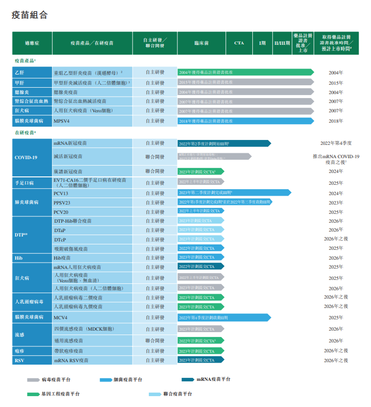 目前公司已商业化八款针对六个疾病领域的疫苗产品,其中包括乙肝肺炎、狂犬病等。同时有针对包括COVID-19在内的13个疾病领域的22款在研疫苗。