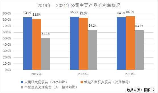 2019年至2021年,公司毛利率分别为77.0%、82.7%及82.5%,毛利率由2019年至2020年的上升,主要是因为公司二类疫苗产品的销量增加,成为总收入的主要来源。