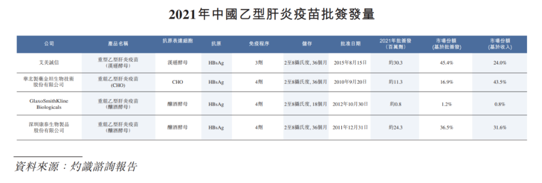 根据灼识咨询的资料,自2015年至2021年,以批签发量计,艾美疫苗为中国及全球最大的乙型肝炎疫苗生产商。于2021年,艾美的乙型肝炎疫苗产品为中国唯一获批签发的乙型肝炎疫苗(汉逊酵母),占批签发总量的45.4%,排名第一。于2021年,按销售收入计,艾美疫苗为中国第三大乙型肝炎疫苗供应商,所占市场份额为24.0%。