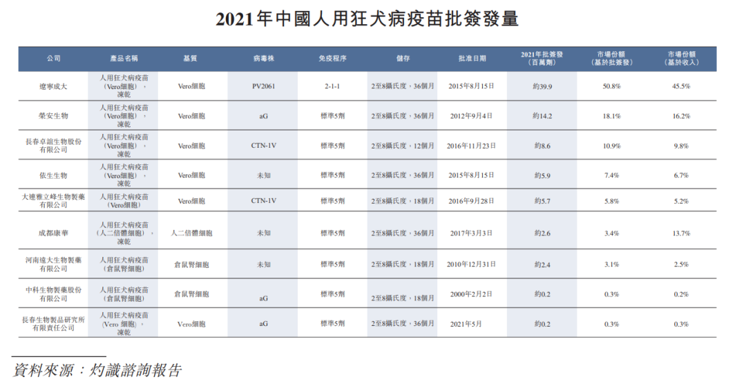 根据灼识咨询的资料,2021年,按批签发量及销售收入计,荣安生物(艾美疫苗的附属公司)在中国和全球均是第二大人用狂犬病疫苗制造商。