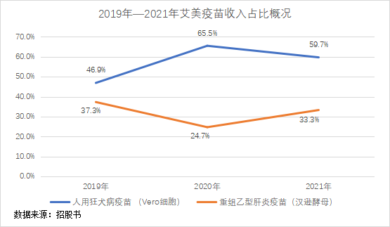 于往绩记录期间,艾美疫苗向中国疾控中心出售绝大部分产品。公司的大部分收入来自人用狂犬病疫苗(Vero细胞)及重组乙型肝炎疫苗(汉逊酵母)的销售,于2019年至2021年,其合计分别占公司总收入的84.2%、90.2%及93.0%。
