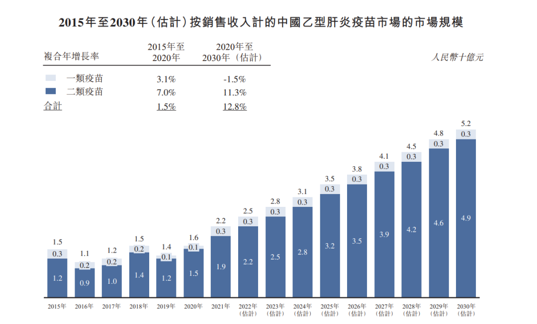 在中国,针对新生儿的乙型肝炎疫苗属于一类疫苗,其余针对所有其他疫苗接种者组别的疫苗属于二类疫苗。尤其受成人接种二类疫苗不断增加驱动,中国的乙型肝炎疫苗市场规模预计将进一步增至2030年的52亿元,复合年增长率为12.8%。