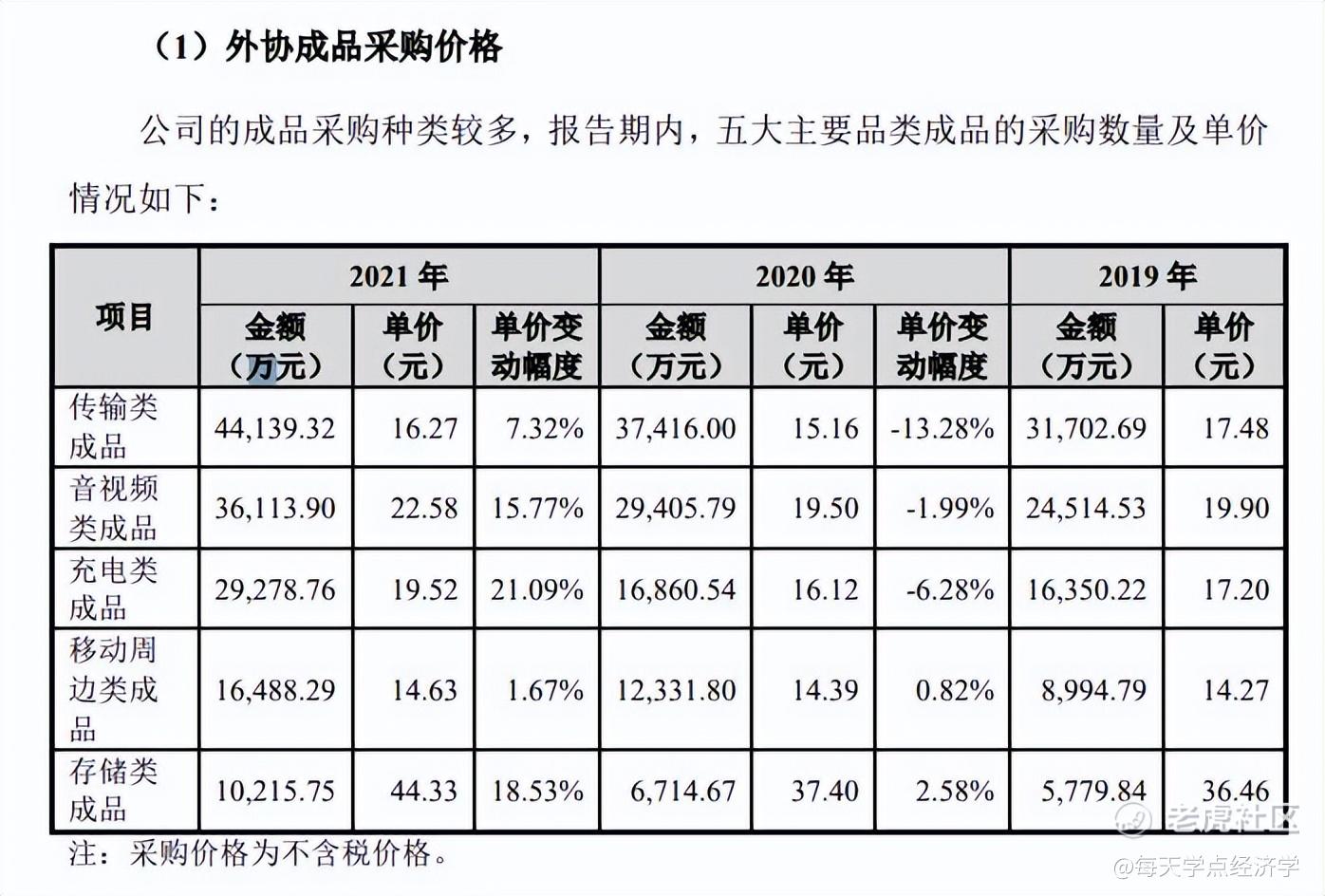 以2021 年为例,成品采购的单价最高涨了 21.09%,平均涨了 3 块多。再加上芯片等零部件采购的价格上涨,才导致绿联陷入利润困局。
