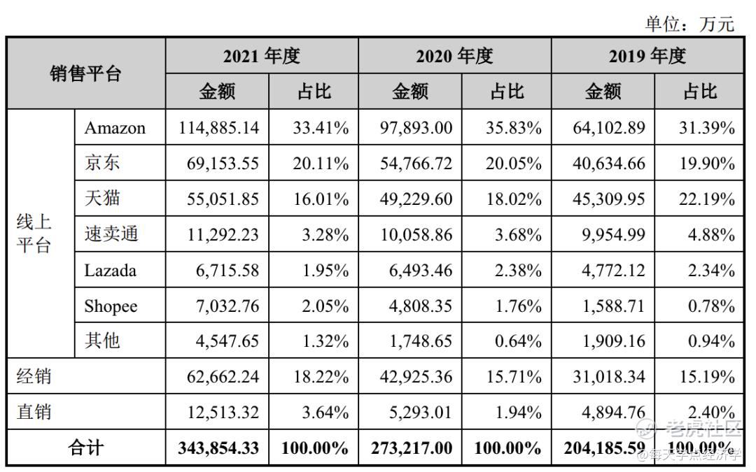 其在2019年-2021年间,来自亚马逊的营收金额分别为6.41亿元、9.78亿元和11.49亿元,占营收比重分别为31.39%、35.83%和33.41%。