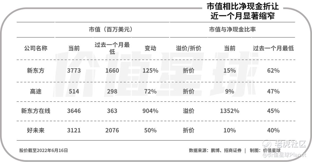 按招商证券国际的统计,5月中旬至6月中旬,教育龙头新东方及好未来的市值相比最近一期报告净现金水平的折让为62%及40%,而现在已经缩窄到15%和10%。