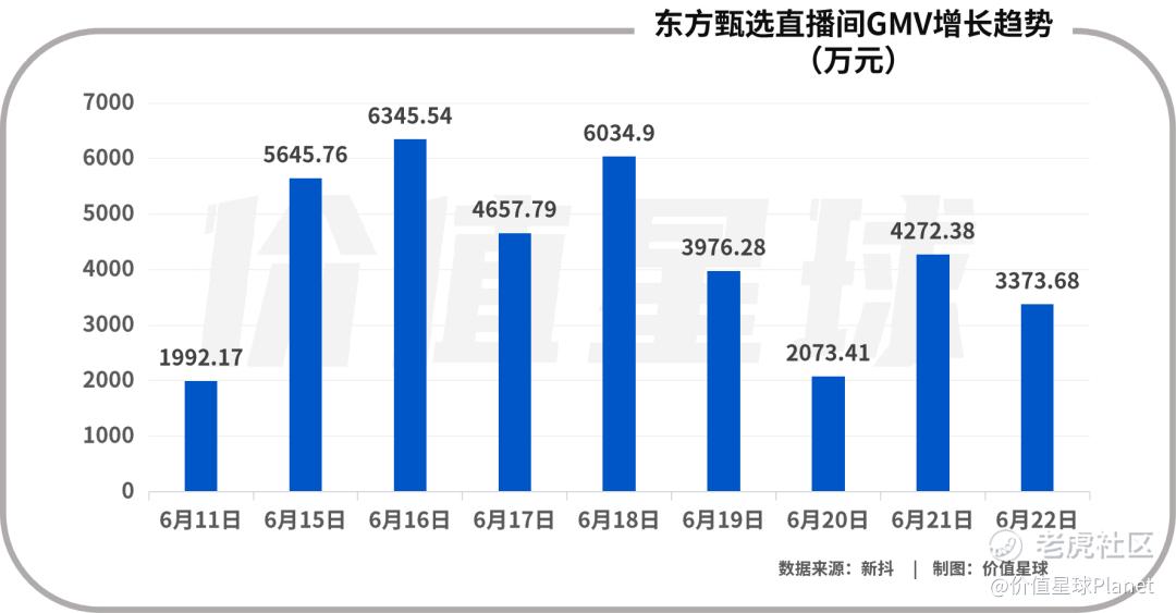 然而自6月以来,东方甄选的双语直播受到网友广泛关注,直播间人气有所上升。公开信息显示,从6月10日开始,东方甄选粉丝、直播间在线人数以及GMV(商品销售总额)均出现爆发式增长,抖音账号粉丝从不到100万快速增长至6月21日的1770万。其直播间单日GMV快速提升到千万级别,6月16日其直播间单日GMV甚至超过6300万元。