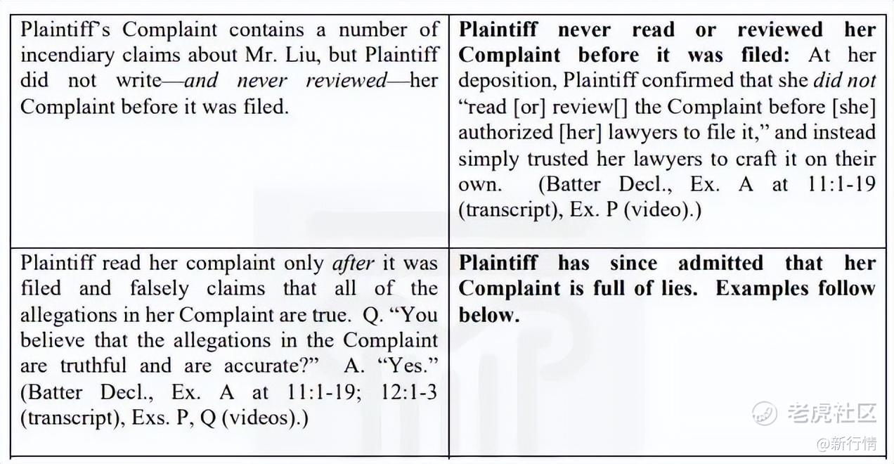 原告证词中确认,“在授权她的律师提交起诉前,没有阅读或审查(起诉书)”,而只是让她的律师自己起草。同时,原告在提交起诉后才看过这份起诉书,并“谎称起诉中的所有指控都是真实的”。