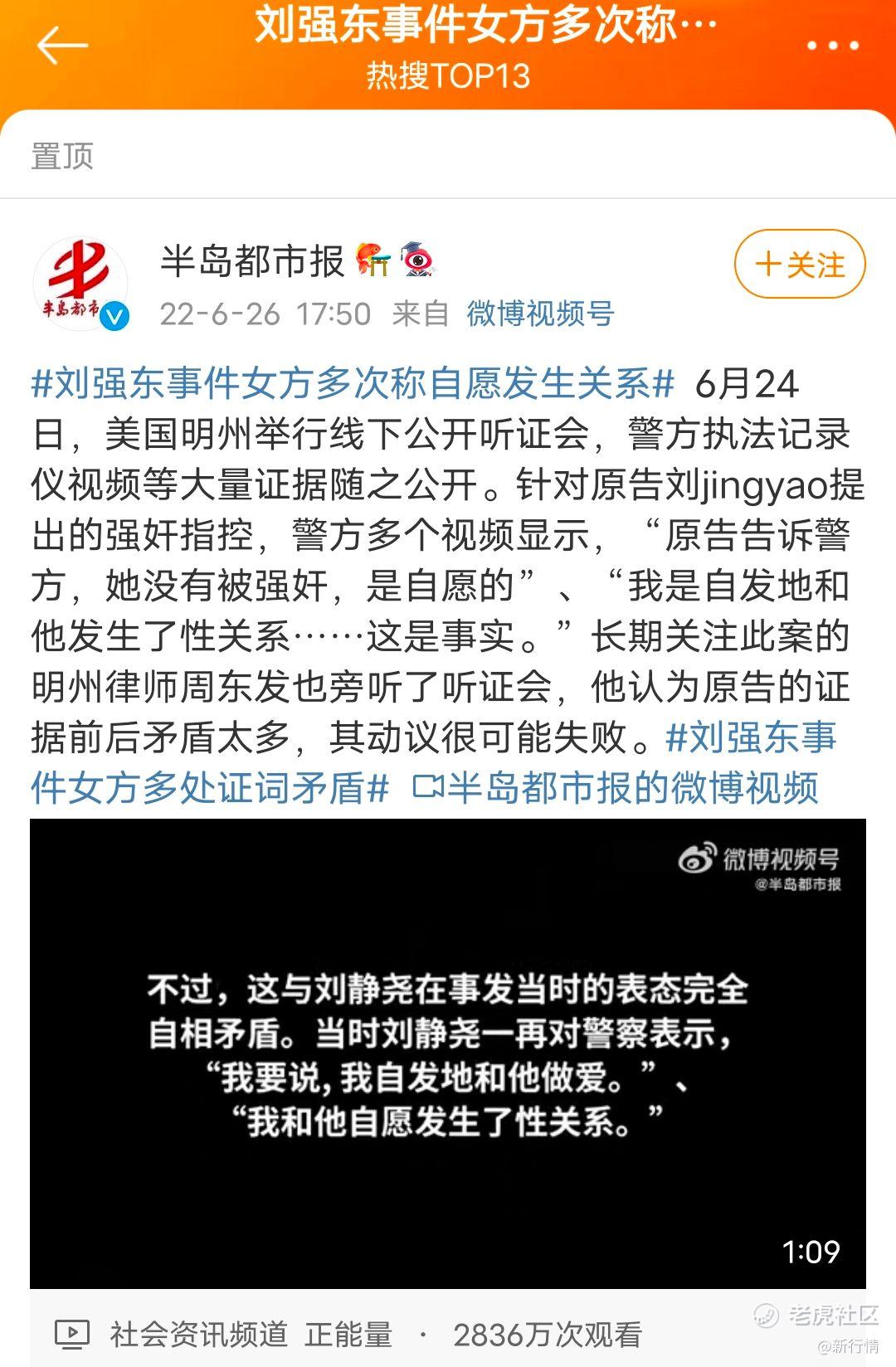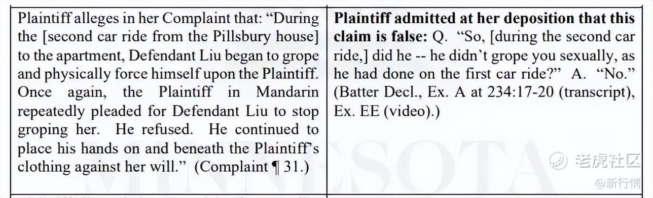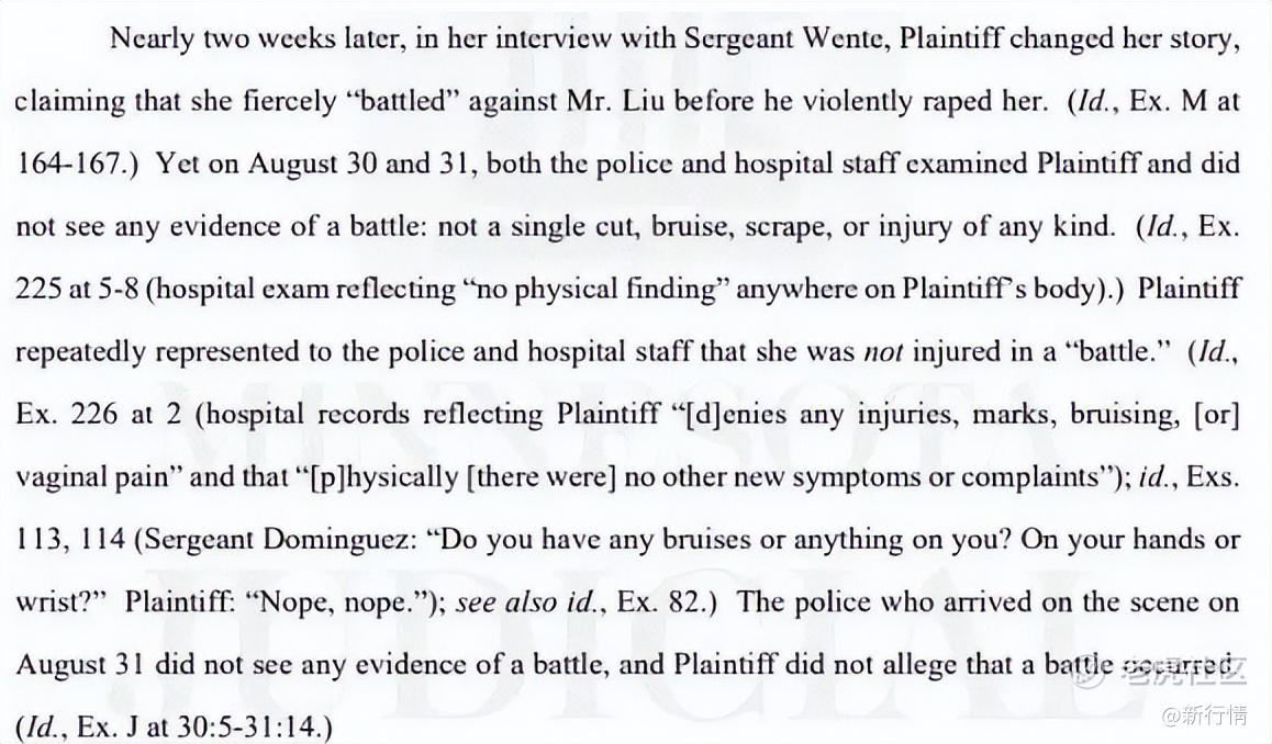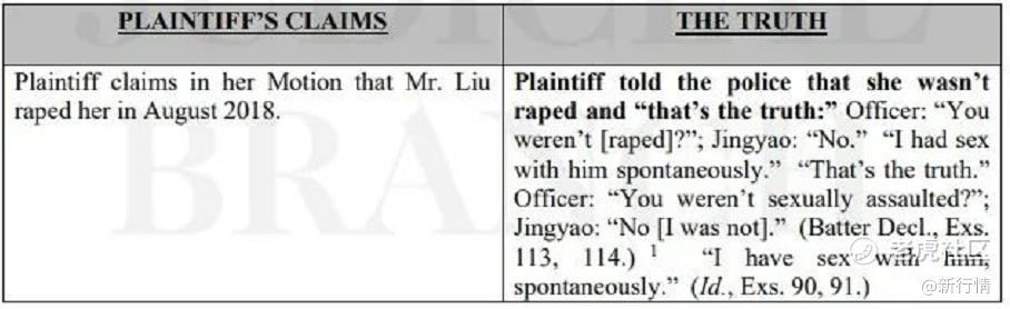 而针对原告刘jingyao提出的**指控,警方多个视频显示,“原告告诉警方,她没有被**,是自愿的”、“我是自发地和他发生了性关系……这是事实。”
