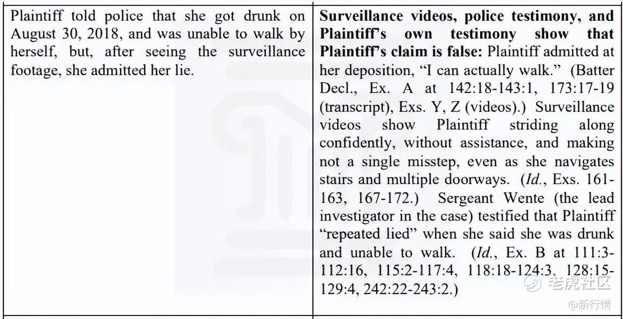 原告曾称自己喝醉了,但在看到监控后,她承认自己说了谎等等。