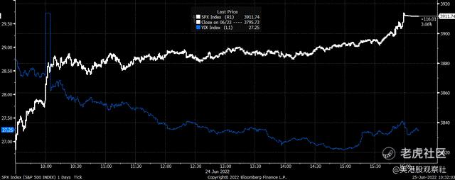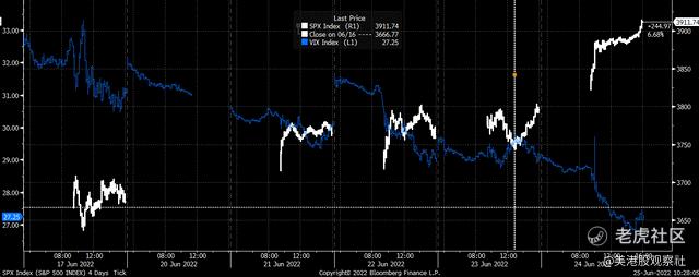 在为期三天的周末结束后,VIX指数周二大幅下跌,但随后在周三走高,周四上午(美东时间)大部分时间接近30。鲍威尔在周四下午1:30左右的发言一结束,VIX指数便开始下跌,引发标普500指数大幅反弹。
