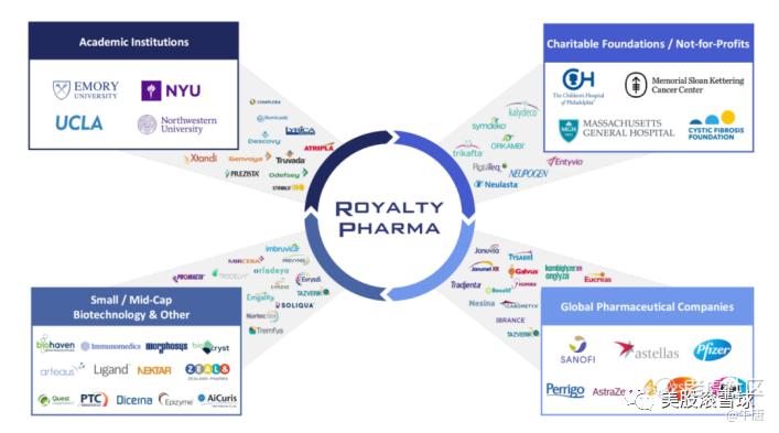 由于不少科研机构、大学、行业协会以及中小型医药公司为已经商业化的药物做出了前期的研究,进而持有这些药物的部分权益。而Royalty Pharma则是与这些机构合作,购买药品的特许权。比较典型的案例有: