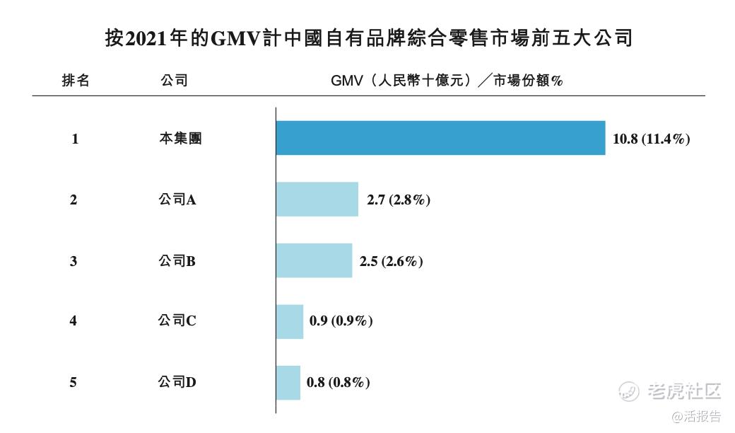 根据弗若斯特沙利文报告,于2021年,公司中国自有品牌综合零售业务的GMV为人民币108亿元,占中国自有品牌综合零售市场的市场份额为11.4%,按GMV计在中国自有品牌综合零售市场排名第一。下图载列按2021年的GMV计中国自有品牌综合零售市场的前五大参与者: