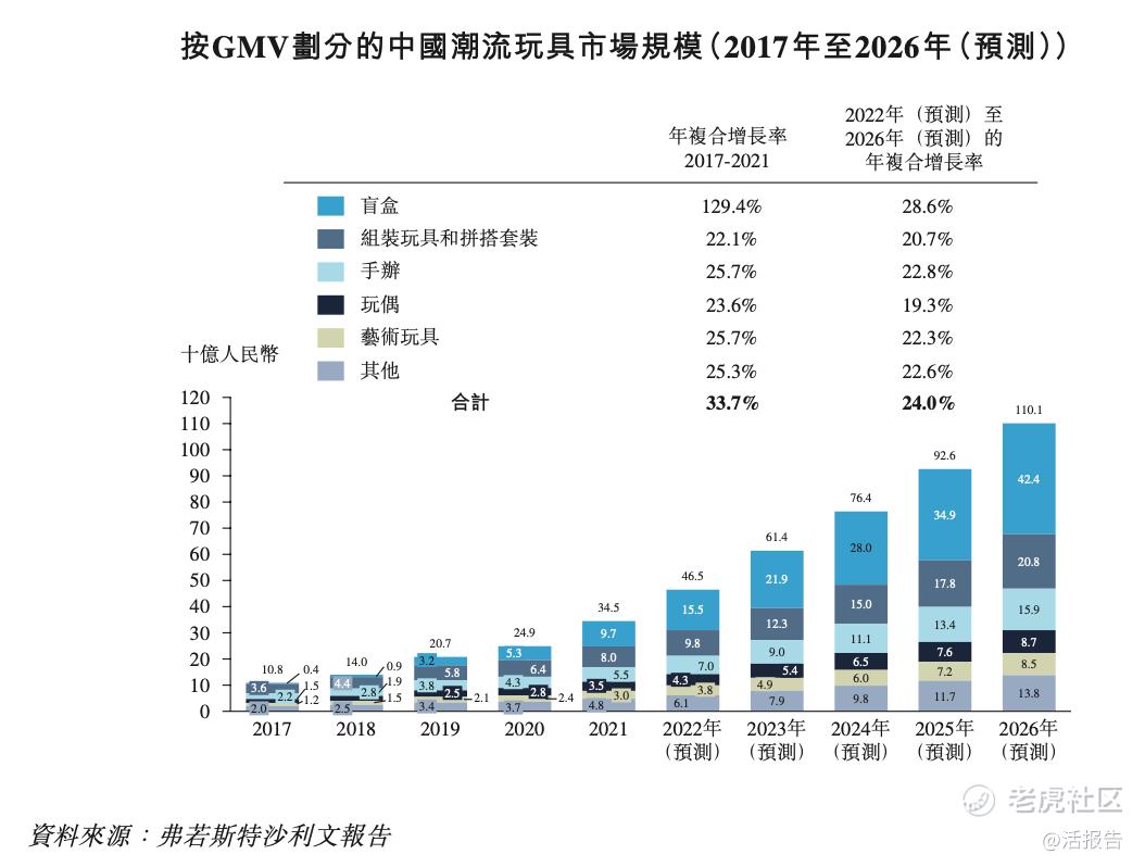 根据弗若斯特沙利文报告,中国的潮流玩具市场在过去五年发展迅速。按GMV计,中国潮流玩具市场规模由2017年的人民币108亿元增至2021年的人民币345亿元,年复合增长率为33.7%,且预计2022年至2026年的年复合增长率为24.0%。下图显示了所列年份按GMV划分的中国潮流玩具市场的规模及其产品类别。