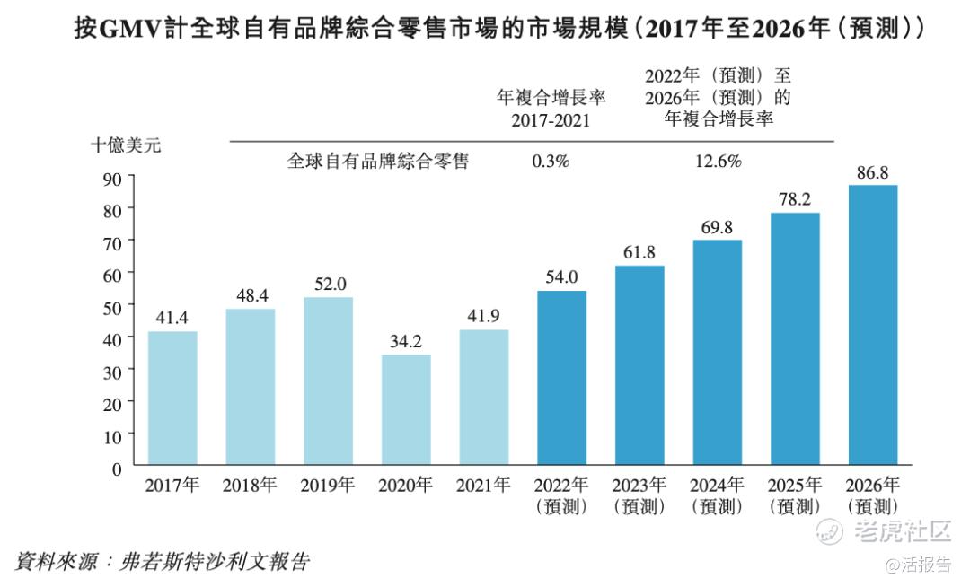 在过去20年内,全球自有品牌综合零售市场稳定增长。根据弗若斯特沙利文报告,按GMV计,全球自有品牌综合零售市场的规模由2017年的414亿美元增至2021年的419亿美元,年复合增长率为0.3%,且预计2022年至2026年期间将以12.6%的加速年复合增长率持续增长。下图说明于所列年度,按GMV计全球自有品牌综合零售市场的规模。