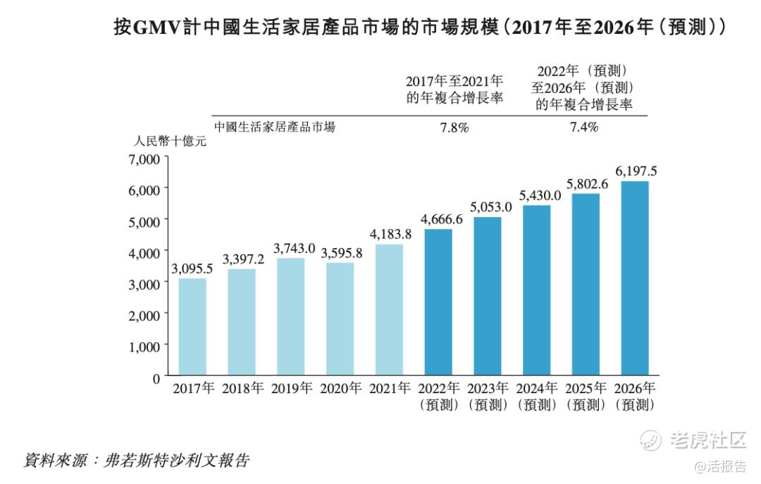 生活家居产品一般指各种消费性家居用品。根据弗若斯特沙利文报告,按GMV计,中国生活家居产品市场的规模由2017年的人民币3.1万亿元增至2021年的人民币4.2万亿元,年复合增长率为7.8%,超过同期中国零售市场4.8%的年复合增长率,且为所有零售分部中增长最快的市场之一。下图说明于所列年度,按GMV计中国生活家居产品市场的规模。