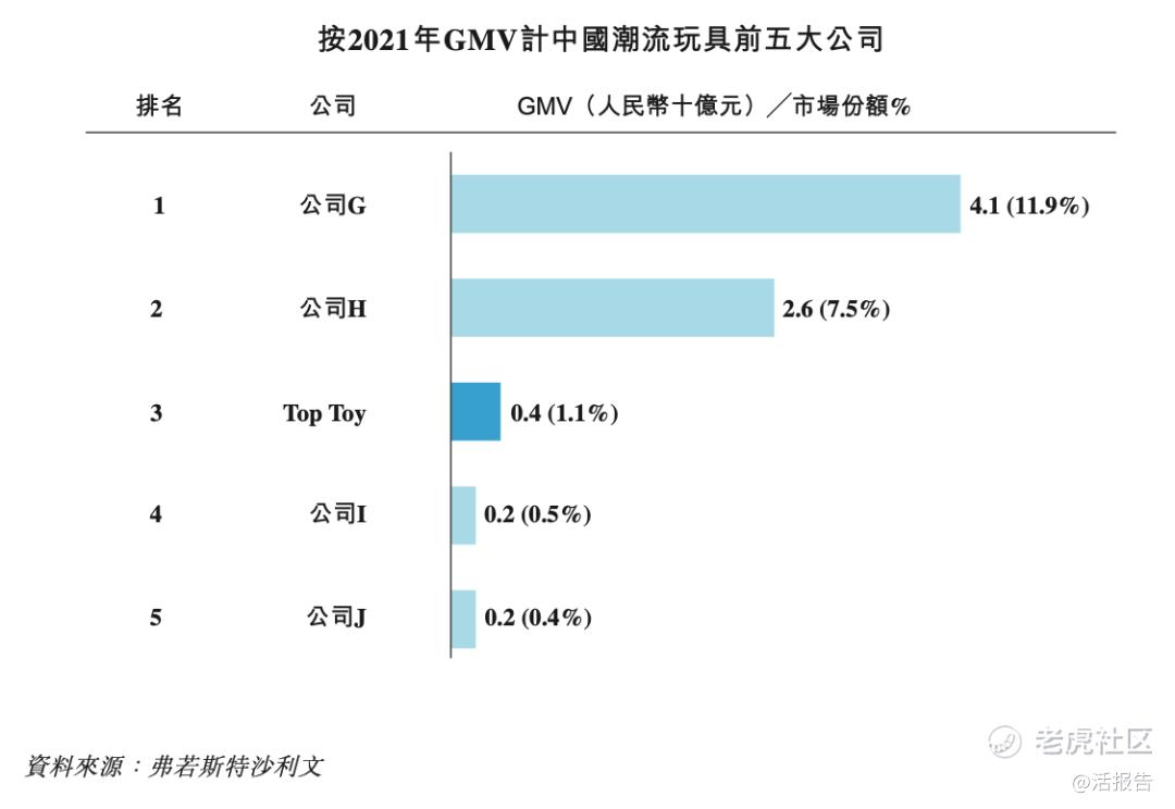 于2021年,公司在中国的潮流玩具业务录得GMV人民币374.4百万元,占中国潮流玩具市场1.1%的市场份额,且根据弗若斯特沙利文报告,按GMV计在中国潮流玩具市场以品牌线下门店为主要GMV来源的参与者中排名第三。