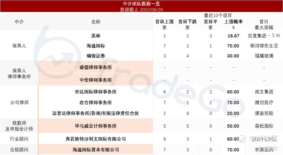 据捷利交易宝数据统计,名创优品中介团队共计11家,其中保荐人共计3家,近10家保荐项目数据表现一般;公司律师共计3家,综合项目数据一般。整体而言中介团队历史数据表现一般。
