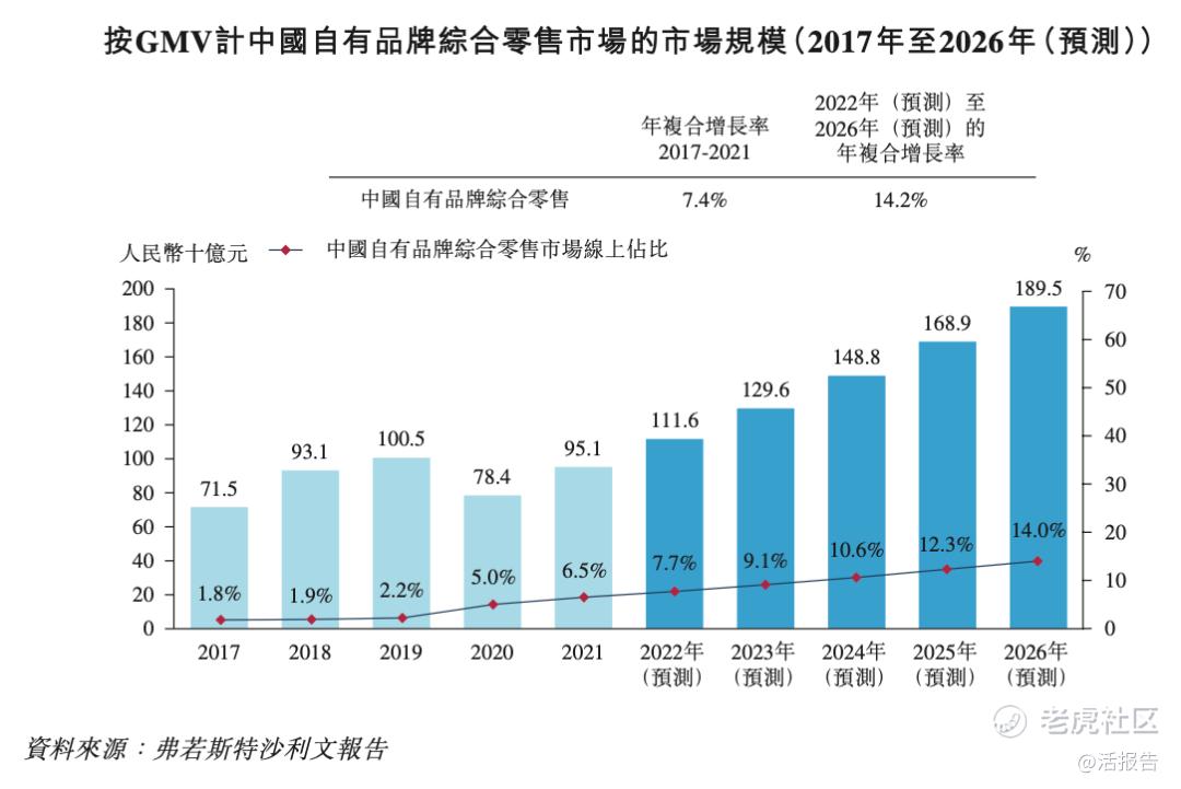 根据弗若斯特沙利文报告,自有品牌综合零售商通常拥有设计出众、优质实惠的丰富生活日用品组合。根据弗若斯特沙利文报告,按GMV计,中国自有品牌综合零售市场的规模由2017年的人民币715亿元增至2021年的人民币951亿元,年复合增长率为7.4%,且预计2022年至2026年期间将以14.2%的年复合增长率进一步增加。下图说明于所列年度,按GMV计中国自有品牌综合零售市场的规模。