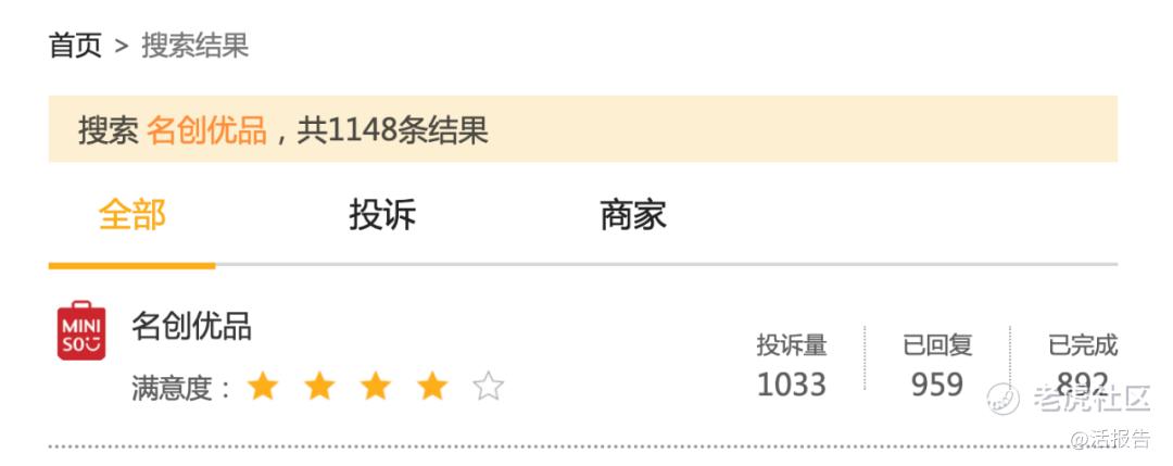 在黑猫投诉上,关于名创优品的投诉量为1033项,已完成892项
