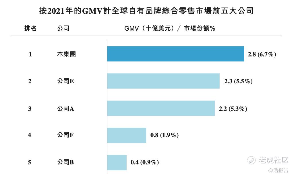 根据弗若斯特沙利文报告,于2021年,公司全球自有品牌综合零售业务的GMV约为人民币180亿元(28亿美元),占全球自有品牌综合零售市场的市场份额为6.7%,按GMV计在全球自有品牌综合零售市场排名第一。下图载列按2021年的GMV计全球自有品牌综合零售市场的前五大参与者: