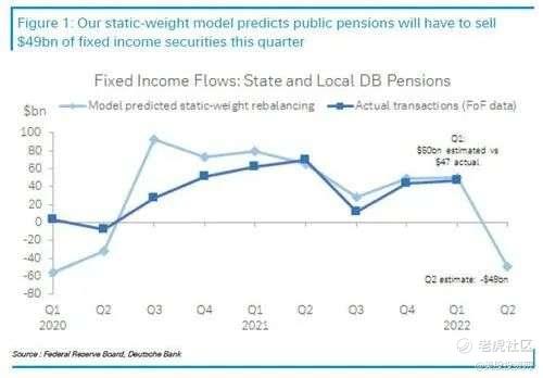养老金买入股票意味着养老金卖出债券,德意志银行固定收益分析师Steve Zeng在一份报告中预测了这一点。他通过DB的静态权重模型估计,在标普500指数下跌19%、总债券指数仅“下滑”6%的情况下,本季度公共和私人养老金将卖出850亿美元的固定收益。