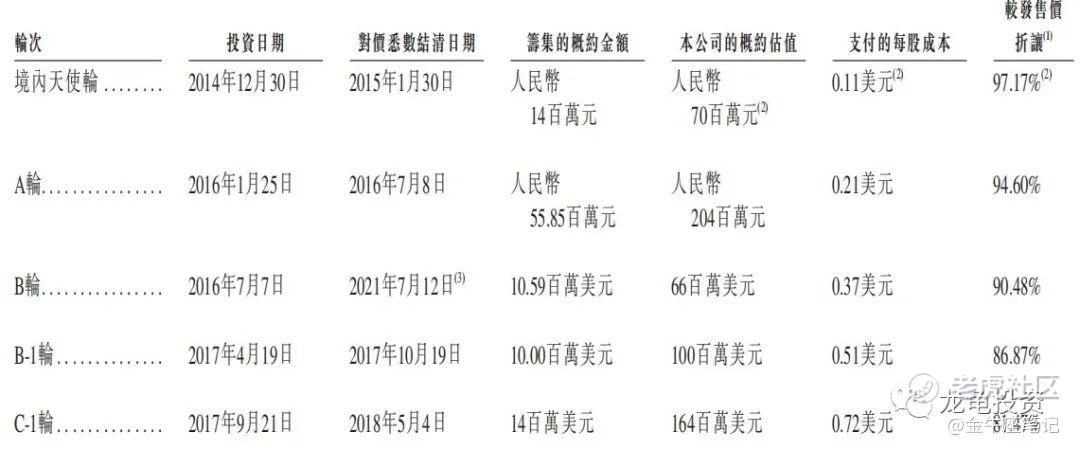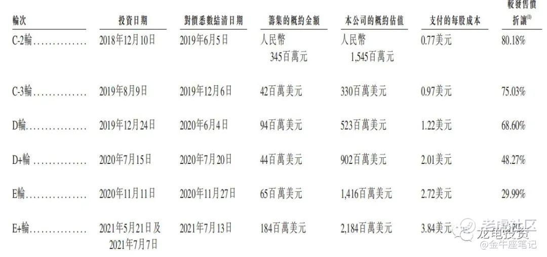 公司于2014年12月30日开始,总共完成了11轮IPO前投资,最后一轮E+轮完成于2021年5月21日及2021年7月7日,完成后估值21.84亿美元,约合171.42亿港元,每股成本3.84美元,约合30.14港元,较发行价折让1.17%,公开发售价基本和一级市场投资者拿货成本价不相上下。IPO前投资者承诺禁售期6个月。