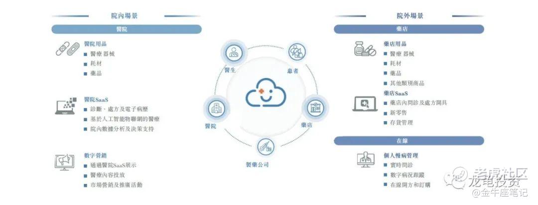 集团为医院和药店提供医疗用品和SaaS产品,为制药公司提供数字营销服务,为患者提供在线问诊和处方开具,主要通过销售医院及药店用品以及个人慢病管理产品产生收益,亦通过提供数字营销、SaaS及其他服务产生收益。