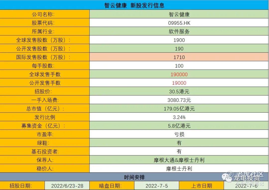 当前港股主打医疗SaaS概念的个股有医渡科技、医脉通,其中医渡科技目前总市值89.38亿,2021年营收8.67亿;医脉通在智云健康的招股书中提到是其在数字营销服务的市场参与者里的领先者,不过这一块收入在智云健康财报里占比很小,而医脉通总市值74.51亿,2021年营收2.84亿;智云健康2021年营收17.56亿,发行总市值179.05亿,就PS对比而言,这个发行市值,不贵也不便宜比较中肯,再叠加其惊人的增长速度,还有行业龙头而言,个人认为存在一定的溢价,但是当前港股打新情绪并不理想,这会限制其涨幅,另外本次发行比例不高,又是双摩联合保荐,小参与问题不大。
