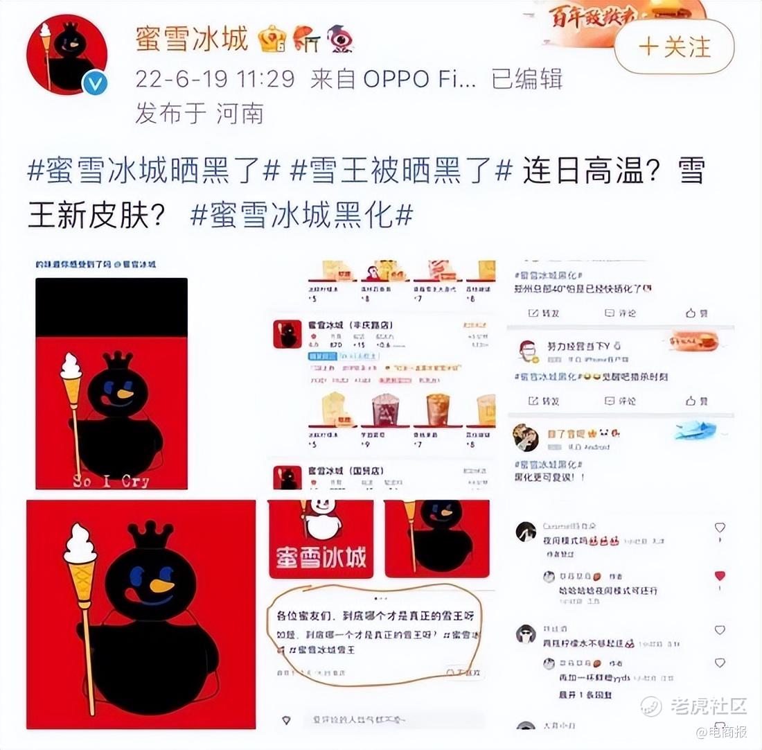 “雪王被晒黑了”、“雪王换新皮肤”、“蜜雪冰城黑化”等词条一度霸榜微博热搜,阅读量突破5亿。