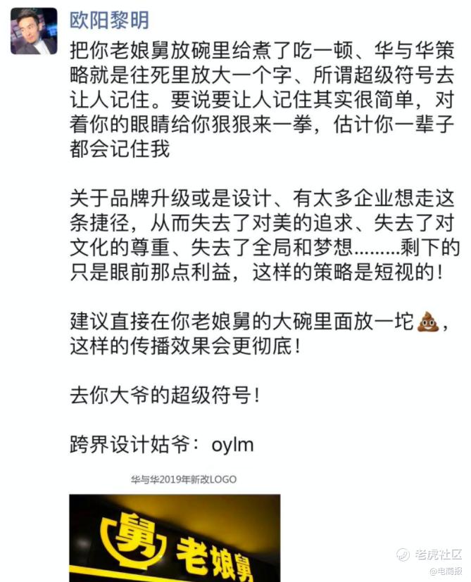 2019年3月14日,一位知名设计师欧阳黎明在自己的微信朋友圈大骂华与华,猛烈抨击华杉给餐饮品牌“老娘舅”新设计的品牌符号。
