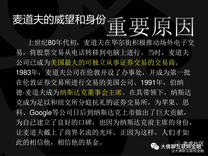 1971年,全球第一个电子交易市场纳斯达克正式成立;1991年,摸爬滚打多年的麦道夫成为纳斯达克董事会主席;2001年,麦道夫公司成为纳斯达克股票市场三大提供上市咨询的经纪公司之一。