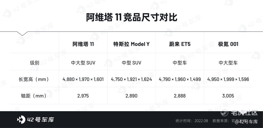 先从这四台车的轴距入手,由大致小的排序是极氪 001 的 3,005 mm,阿维塔 11 的 2,975 mm,特斯拉 Model Y 的 2,890 mm,以及蔚来 ET5 的 2,888 mm。