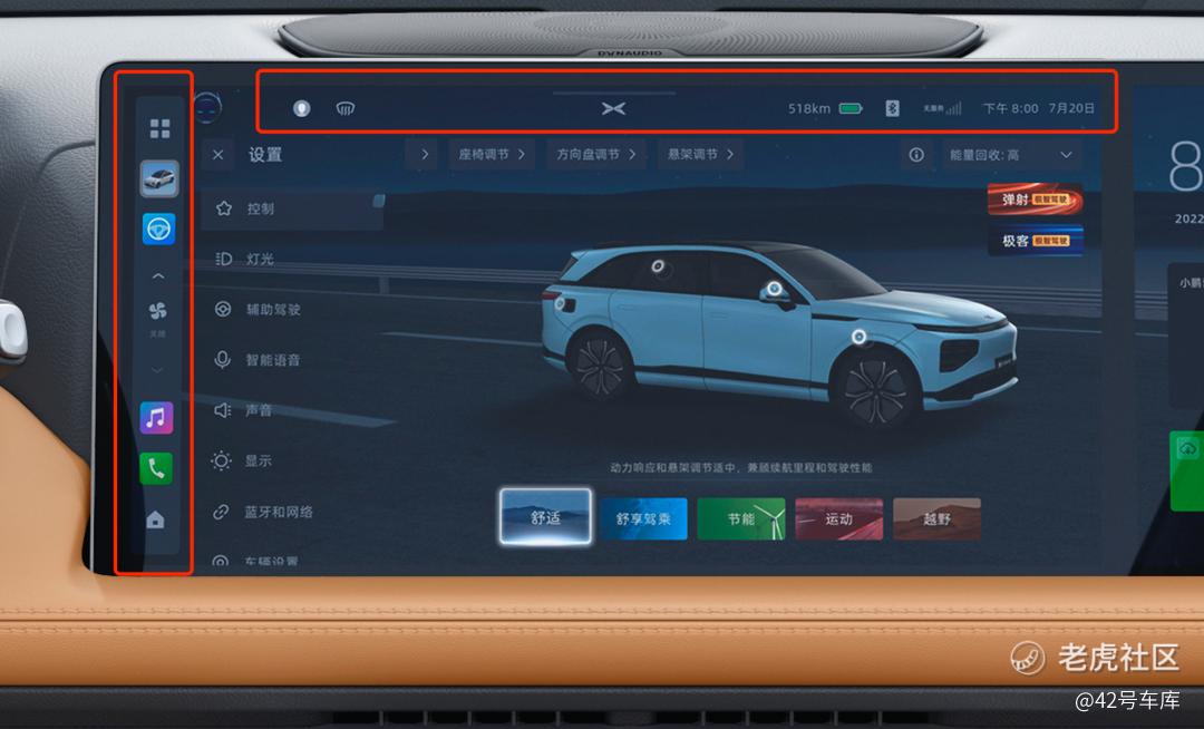 - 在 P7 上小鹏有 2 个设置入口,一个用于车辆设置,调节辅助驾驶、驾驶模式等等;另一个用于车机设置,调节亮度、显示颜色等等。对于用户而言两个设置并不利于使用过程中的功能寻找,经常会出现在车辆设置中找了半天,发现在系统设置中,而在 G9 的渲染图中可以看出,小鹏已经将 2 个设置整合到了一起;