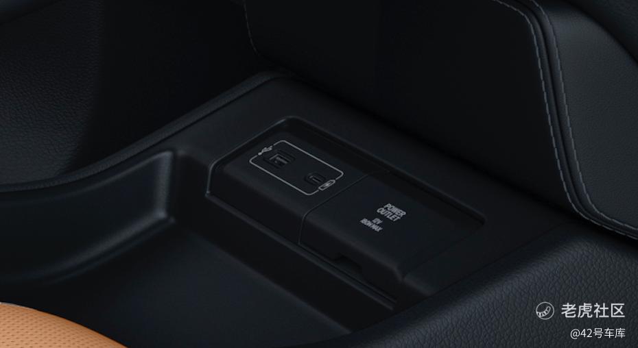 中控台下方的镂空储物槽中,有一个 USB A 和一个 Type-C 充电口,USB A 最大支持 2.4 A 充电,Type—C 支持 60 W 供电,可以给一些轻薄笔记本供电,满足部分人群的办公需求。旁边的 12 V 点烟器,最大支持 180 W 的供电能力。