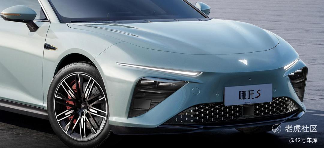 哪吒 S 同样将激光雷达布置在大灯组下方,整体看起来丝毫没有突兀的感觉。在工业设计上,与大灯组集成的方案,其设计难度要显著低于头顶布局。