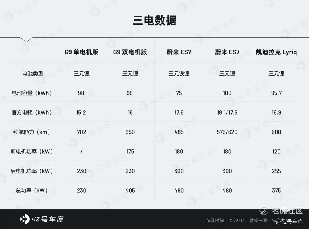 横向对比 ES7 等车型后发现,G9 所搭载的 98 kWh 电池包与 ES7 所搭载的 100 kWh 电池包在容量上相差不多,但续航里程非常出色,单电机车型甚至超过了 700 km。蔚来 ES7 全新电机在输出功率上要来得更「猛烈」,前后双电机总功率达到了 480 kW。