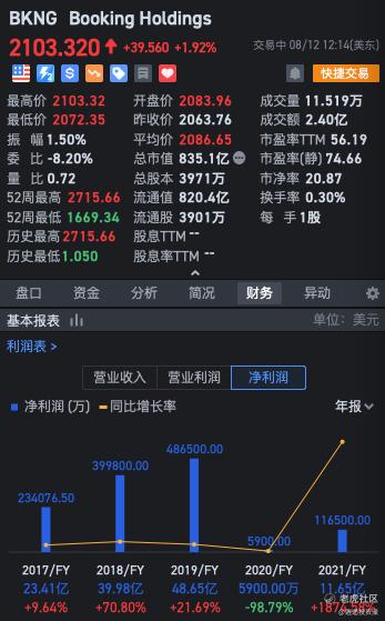 目前市盈率75,市盈率TTM56,如果全年收入达到30亿,市盈率为28,考虑到疫情前Booking的高增长以及疫情期间超强的韧性,虽然价格偏高,但还是可以谨慎选择(⭐️)