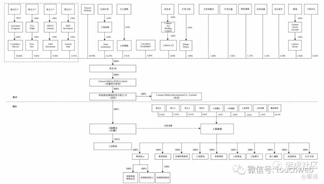 IPO前,柠萌影视的联合创始人苏晓、陈菲女士、徐晓鸥女士及周元通过彼等各自全资拥有的境外控股公司(包括Lemontree Evergreen、Lemontree Harvest、Free Flight、Faye Free、MEOO Limited、A&O Investment、Z&N Investment及LinmonRun(统称「创始人SPV」))分别间接持有公司已发行股本约20.60%、9.56%、9.56%及6.55%。