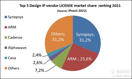 从图中可以看出,Synopsys是IP许可收入的第一赢家,2021年市场份额为31.2%,而Arm以25.6%的市场份额排名第二(Arm的主要收入来源为版税,市场占有率超过60%)。