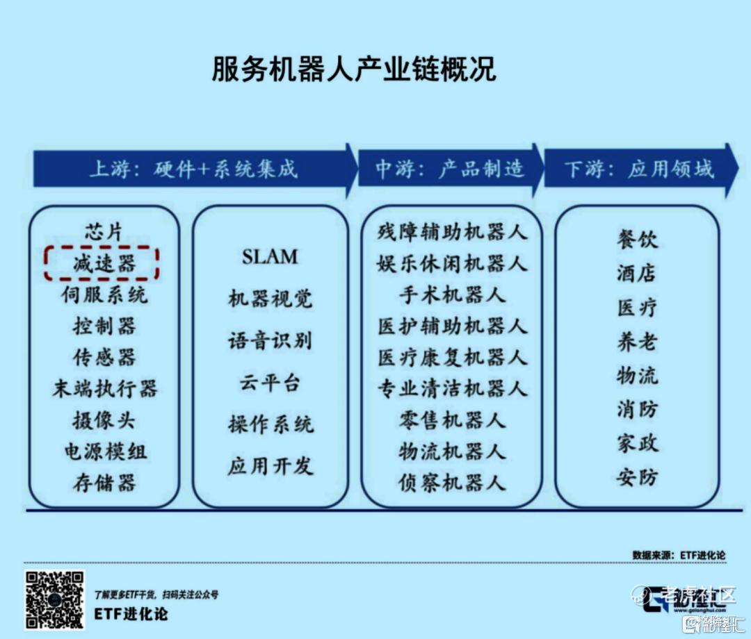 服务机器人产业链上游包括芯片、伺服系统、控制器、传感器、减速器以及机器视觉、语音识别等系统集成,中游包括各类服务机器人制造,下游涵盖众多服务行业:餐饮、酒店、医疗、养老、物流、消防、家政等。