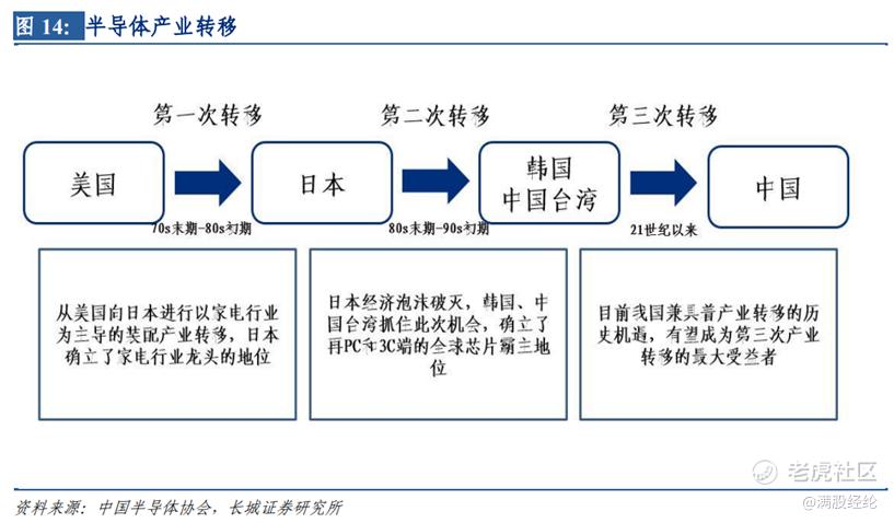 美国是全球率先实现半导体技术原始积累的国家,凭借资本及技术优势迅速成为全球半导体产业链的主导。之后半导体产业有过两次转移,并逐步扩散至世界各地。