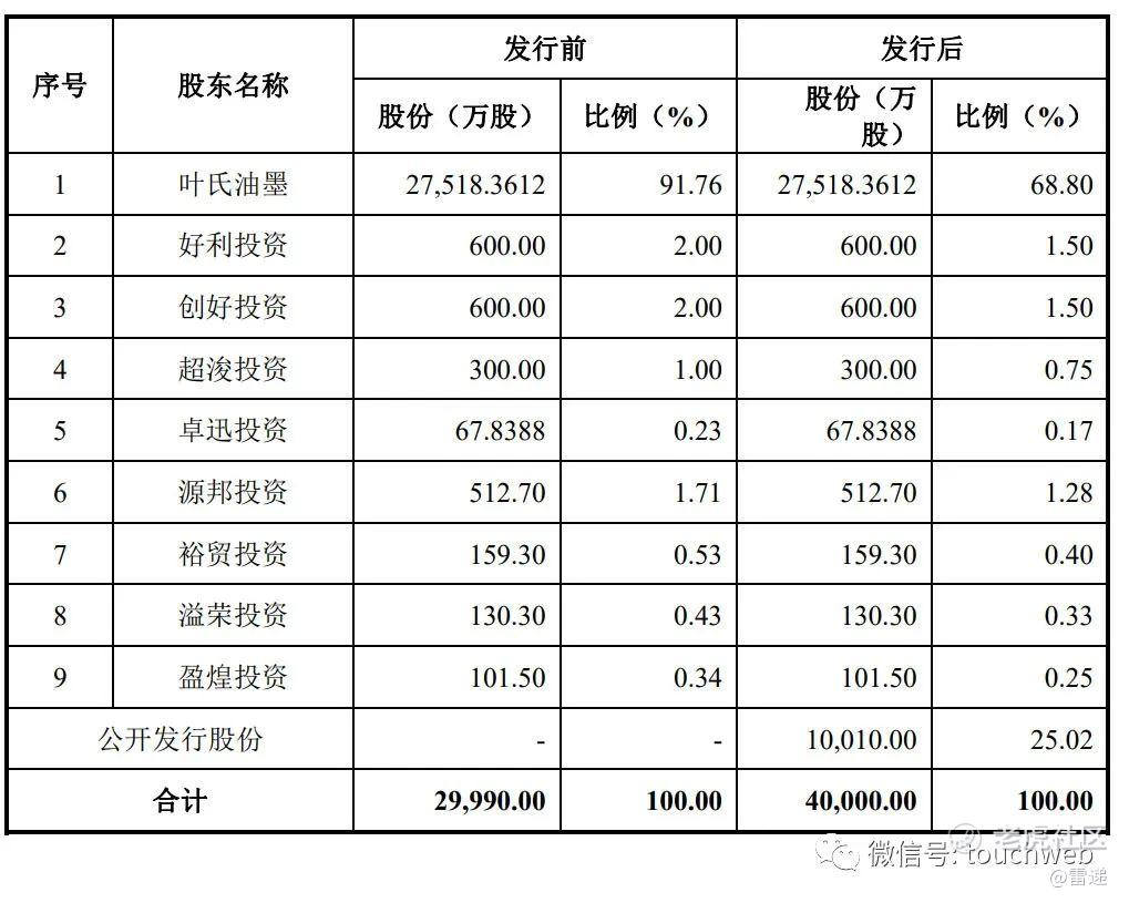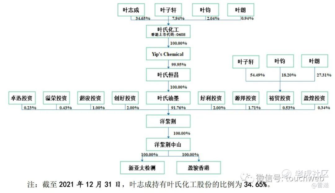 IPO前,叶志成直接或间接持股为34.65%,叶志成的妻子梁碧瑜通过个人和叶志成慈善基金有限公司持有叶氏化工股份,通过个人持有叶氏恒昌股份,合计持有洋紫荆油墨股份2.63%。