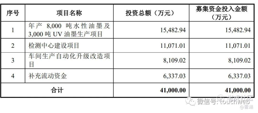 洋紫荆油墨曾计划募资4.1亿元,其中,1.55亿元用于年产8000吨水性油墨及3000吨UV油墨生产项目,1.1亿元用于检测中心建设项目,8109万元用于车间生产自动化升级改造项目,6337万元用于补充流动资金。