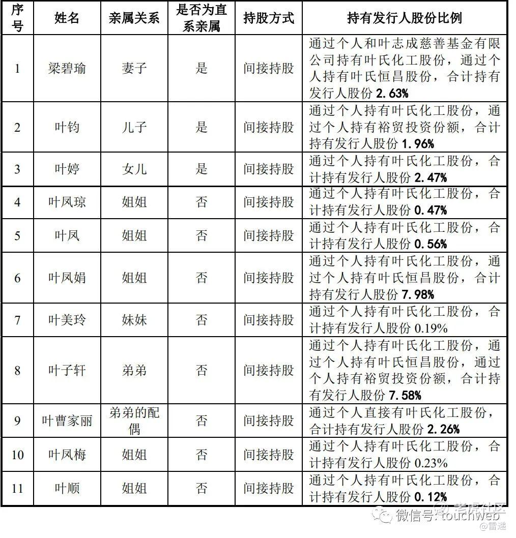 其中,叶志成的姐姐叶凤琼通过个人持有叶氏化工股份,合计持有洋紫荆油墨股份0.47%;