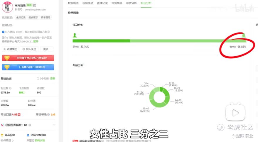 说到这里,你是不是感觉非常熟悉?罗敏去东方甄选直播间刷礼物蹭流量,难道只是因为流量大吗?不,还因为董宇辉等各位老师,很受宝妈等女性群体的信赖。数据显示,东方甄选直播观看用户中,女性占比2/3,24-40岁人群占比接近50%。