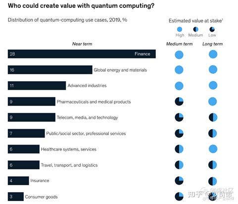 从上个世纪的Shor算法(解决大数因数分解问题,可以快速破解经典加密里常用的RSA密钥,量子算法来源于此),Grover搜索算法(可用于数据库搜索),到近些年的HHL算法(用于量子机器学习,从金融交易到交通规划再到等离子体模拟等),各种各样的量子算法层出不穷,除此之外量子系统还在生物制药化学分析乃至能源等方面有着重要的意义。下图是麦肯锡评估的量子计算可以为各行业贡献的市场份额图,可见一斑。